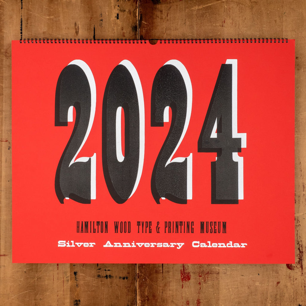 In 2024, Hamilton celebrated its 25th year as a museum. Museum Master Printer Jim Moran chose to commemorate the anniversary by producing an oversized (19x24”) calendar that showcased the museum’s collection of wood type and image blocks.