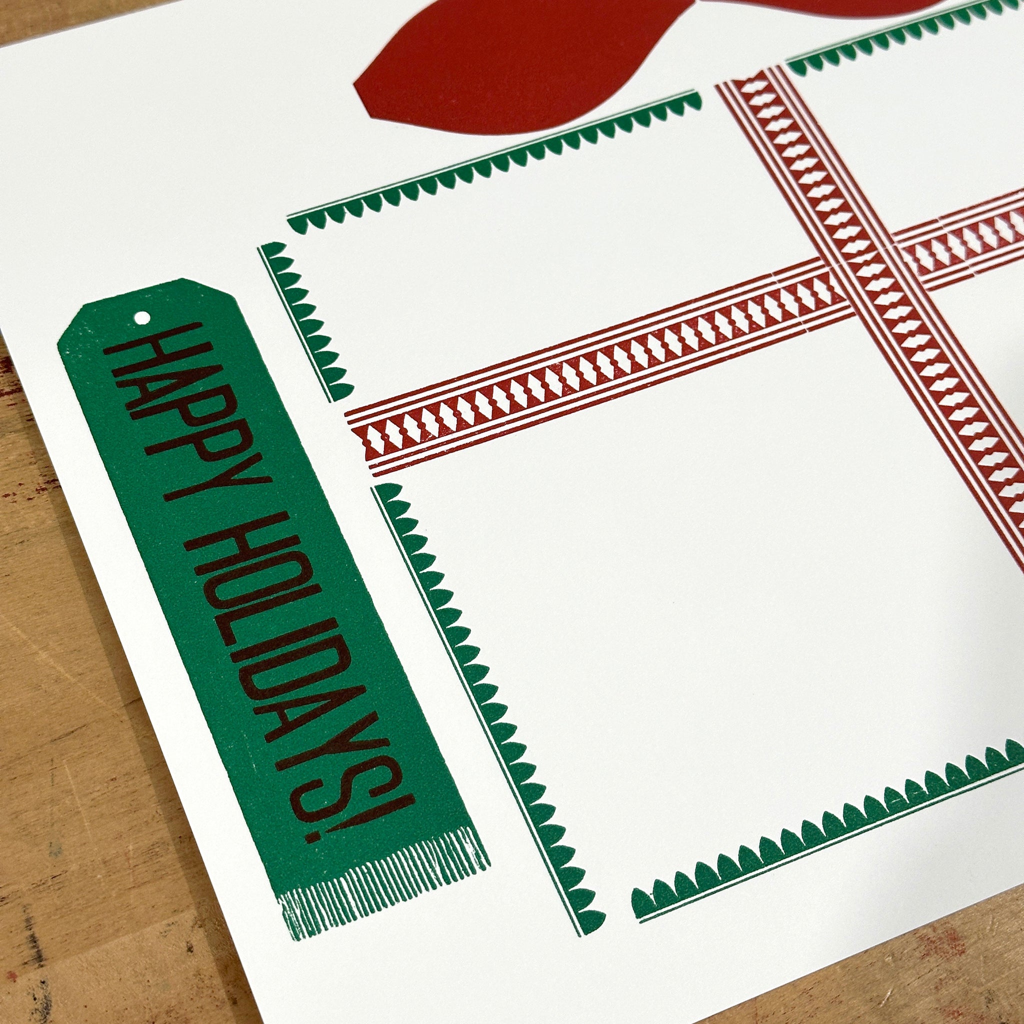 This festive holiday poster features a wrapped present accented with a red ribbon and a joyful “Happy Holidays” tag.